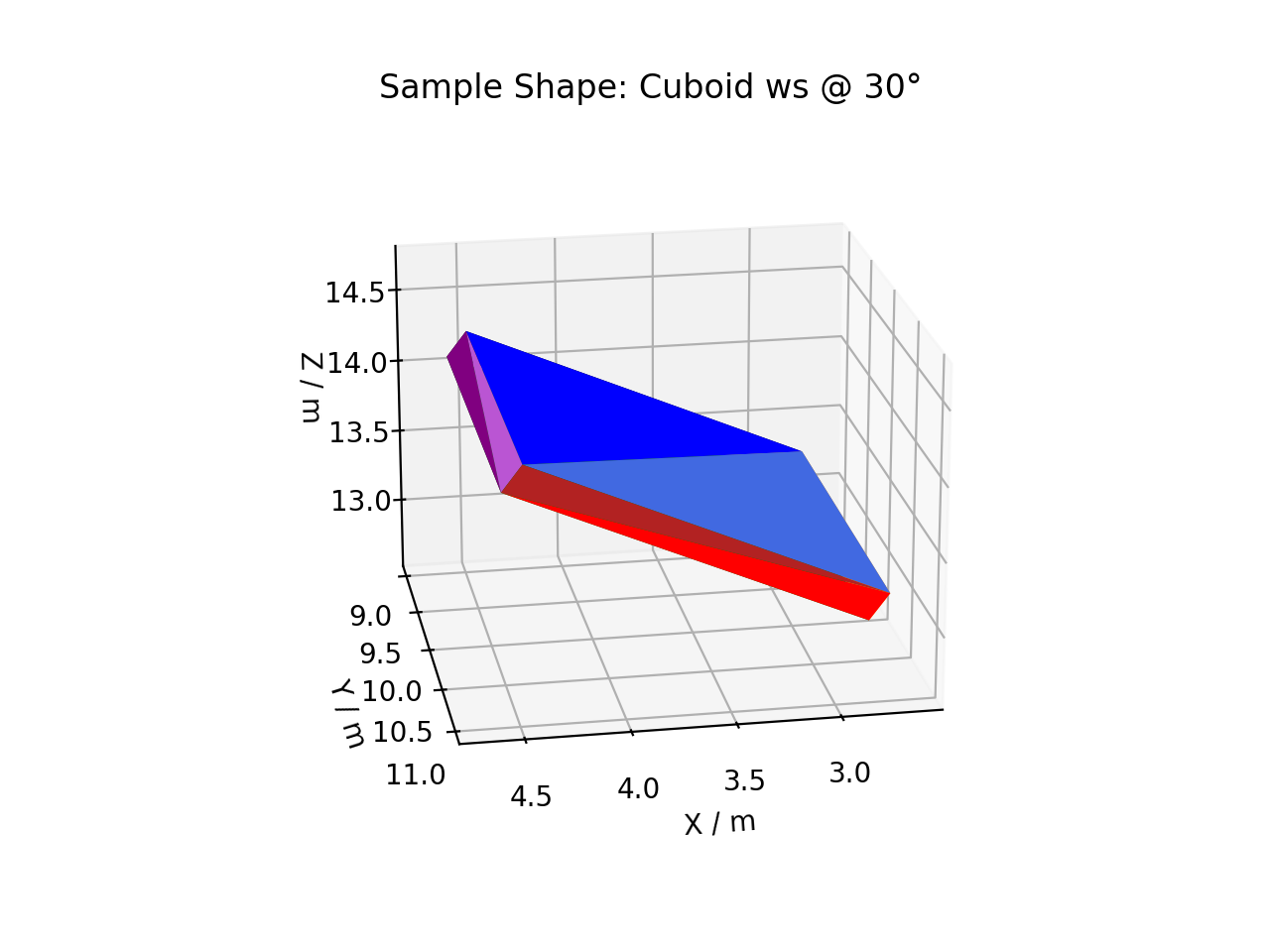 SetSample can be used to apply an automatic goniometer rotation. SetGoniometer should be called before SetSample. After running this example code to rotate a cuboid by 30° anti-clockwise around y, the sample shape can be plotted (see 3D Mesh Plots for Sample Shapes):
