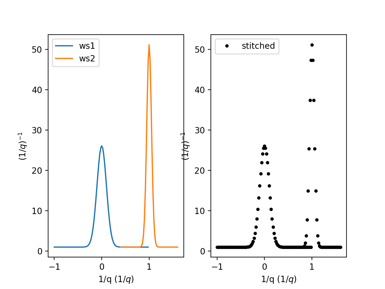 stitched, scale = Stitch1D(LHSWorkspace=ws1, RHSWorkspace=ws2, StartOverlap=0.4, EndOverlap=0.6, Params=0.02)