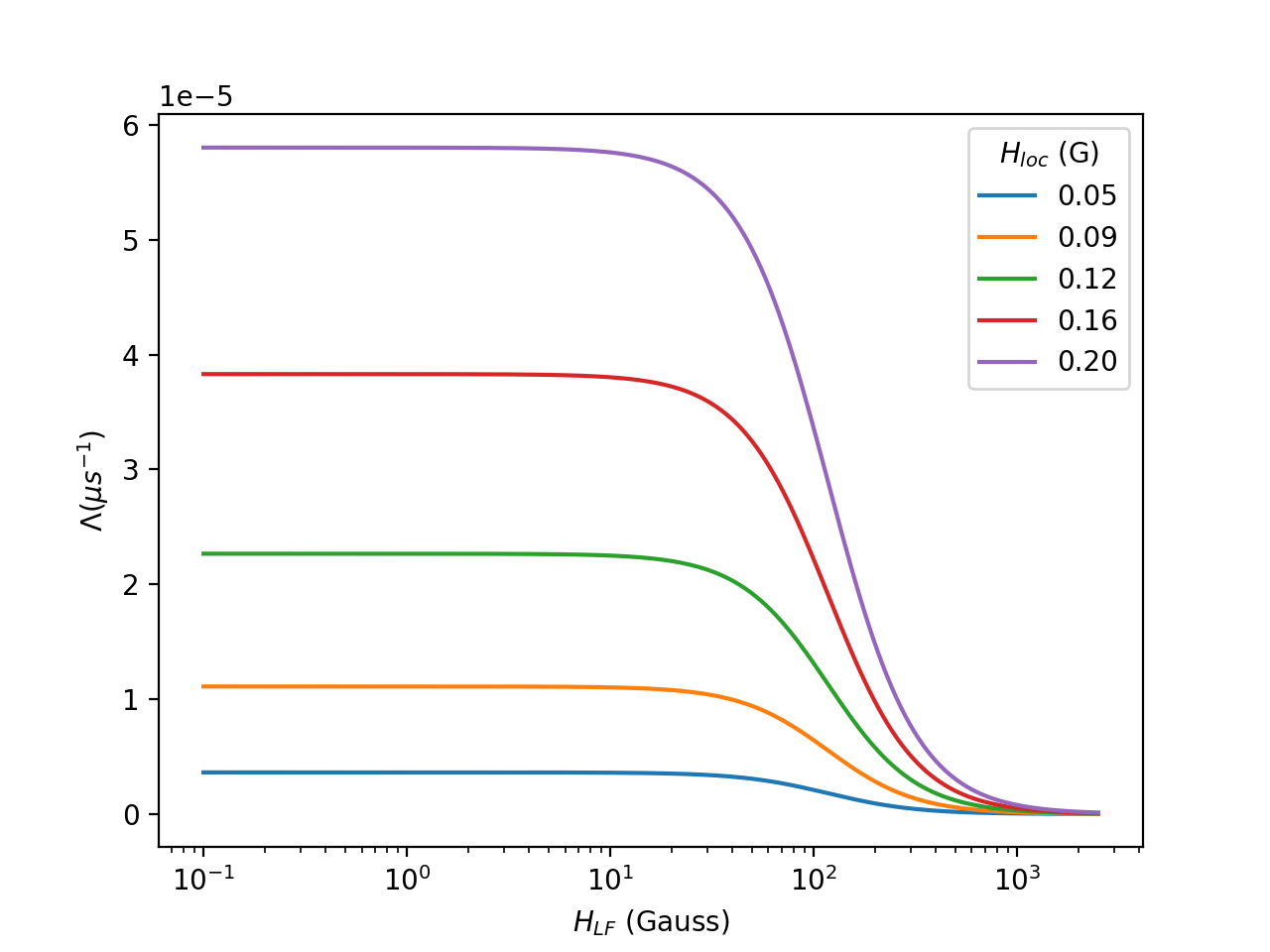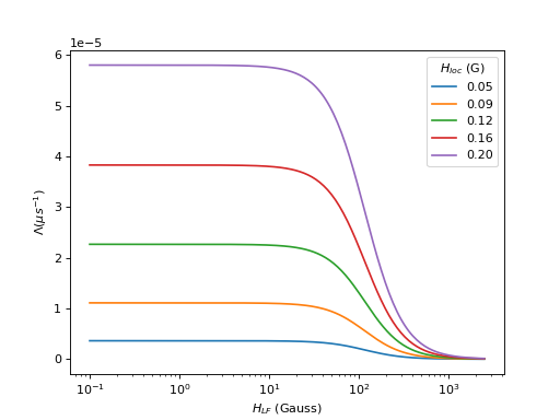 The Redfield formula for the Longitudinal Field (LF) dependence of the muon spin relaxation rate, \(\Lambda\), given in units of \(\mu s^{-1}\), with the applied longitudinal magnetic field, for given local magnetic field (\(H_\text{loc}\)) and correlation time of fluctuations at muon spin sites (\(\tau\)) is: