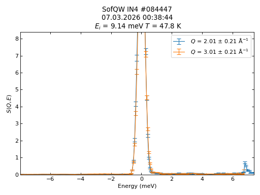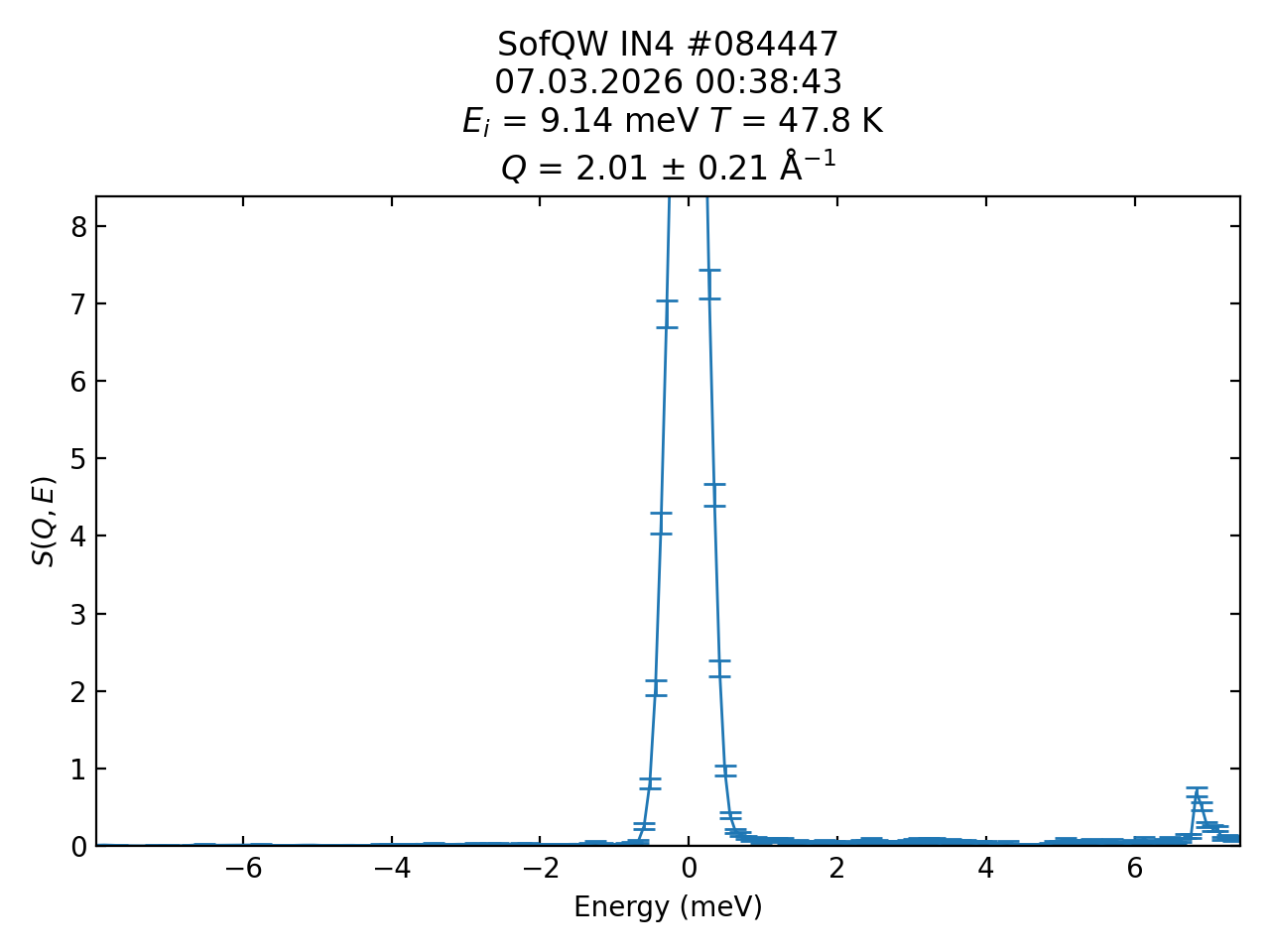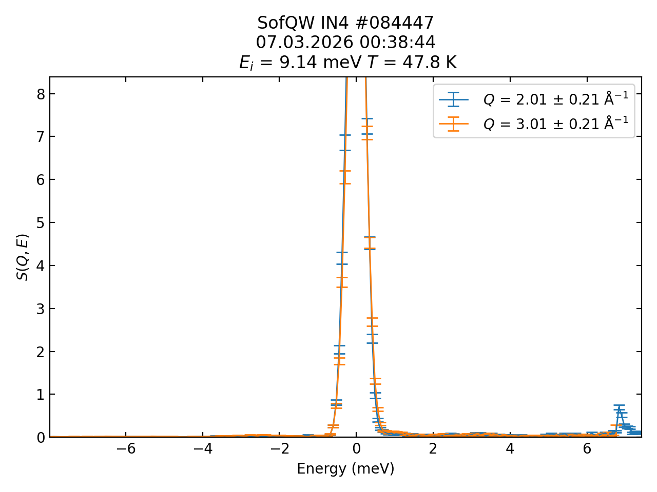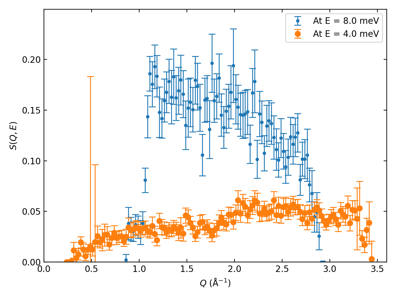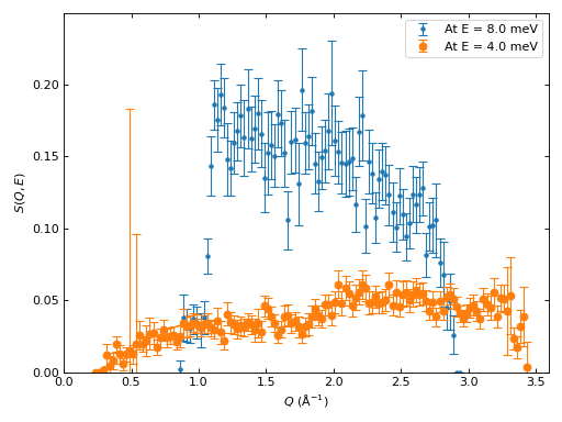 An important aspect of examining the \(S(Q,E)\) workspace is to plot cuts at constant \(Q\) and \(E\). This can be done by directtools.plotconstQ() and directtools.plotconstE():