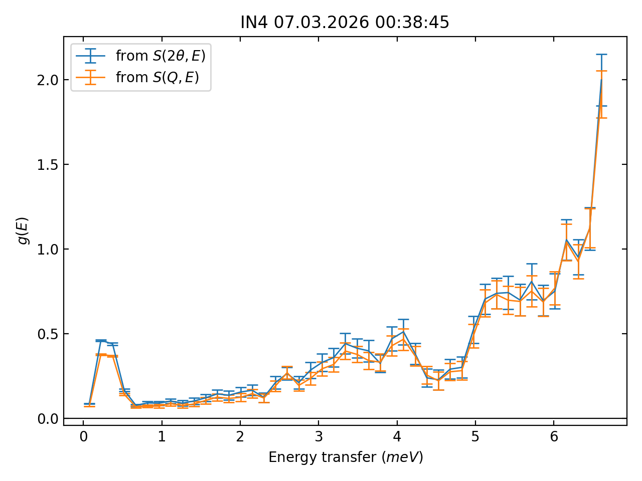 The density of states data calculated by ComputeIncoherentDOS can be plotted by the directtools.plotDOS() function. The function accepts a single workspace or a list of workspaces as its arguments. The example below shows a comparison of densities of states calculated from \(S(Q,E)\) and \(S(2\theta,E)\):