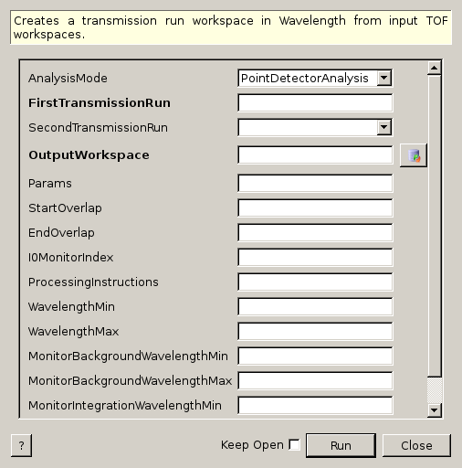 | OutputWorkspace | Output | MatrixWorkspace | Mandatory | Output transmission workspace in wavelength. |