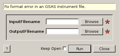 | InputFilename | Input | string | Mandatory | Name of the GSAS instrument parameter file to get fixed for format. Allowed extensions: [‘.prm’, ‘.iparm’] |