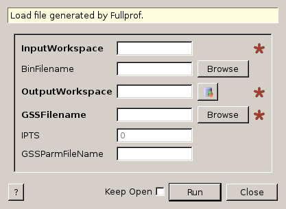 | GSSFilename | Input | string | Mandatory | Name of the output GSAS file. Allowed extensions: [‘.gda’] |