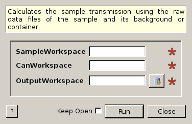 Calculates the sample transmission using the raw data files of the sample and its background or container by dividing the monitor spectrum of the sample workspace by that of the container.