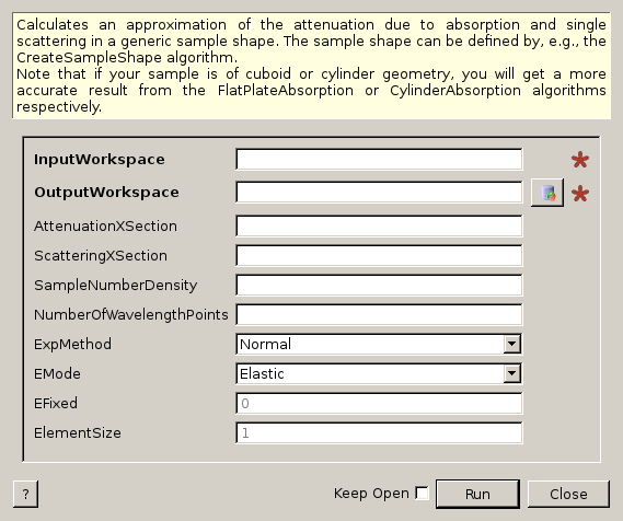 Calculates an approximation of the attenuation due to absorption and single scattering in a generic sample shape. The sample shape can be defined by, e.g., the CreateSampleShape algorithm. Note that if your sample is of cuboid or cylinder geometry, you will get a more accurate result from the FlatPlateAbsorption or CylinderAbsorption algorithms respectively.
