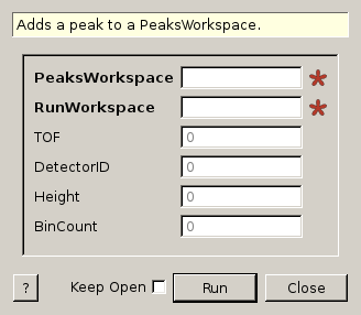 AddPeak(PeaksWorkspace=peaks_ws,RunWorkspace=ws,DetectorID=101,TOF=3819,Height=10.3,BinCount=2)