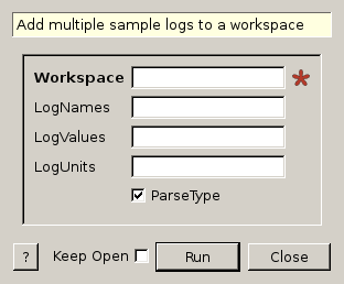 This algorithm provides a way of adding multiple sample log entries to a workspace at once by making multiple calls to the AddSampleLog v1 algorithm.
