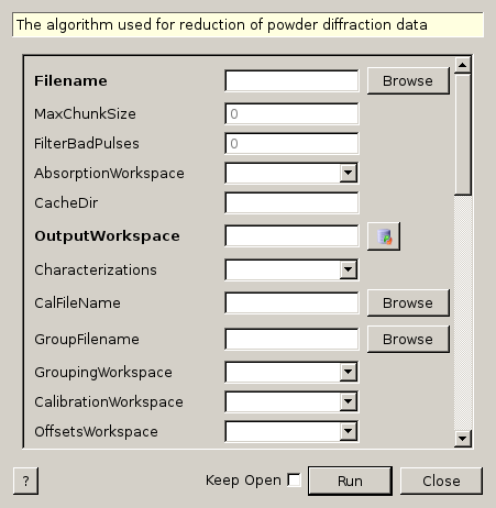 | Filename | Input | list of str lists | Mandatory | Files to combine in reduction. Allowed extensions: [‘_event.nxs’, ‘.nxs.h5’] |