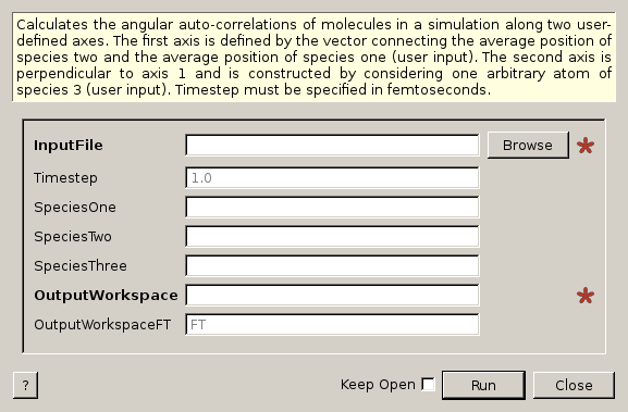 Calculates the angular auto-correlations of molecules in a simulation along two user-defined axes. The first axis is defined by the vector connecting the average position of species two and the average position of species one (user input). The second axis is perpendicular to axis 1 and is constructed by considering one arbitrary atom of species 3 (user input). Timestep must be specified in femtoseconds.
