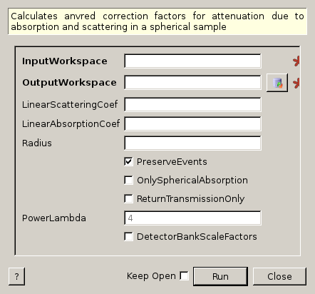 | OnlySphericalAbsorption | Input | boolean | False | All corrections done if false (default). If true, only the spherical absorption correction. |
