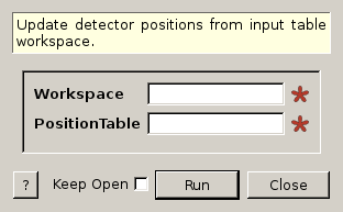 | PositionTable | Input | TableWorkspace | Mandatory | The name of the table workspace containing the new positions of detectors |
