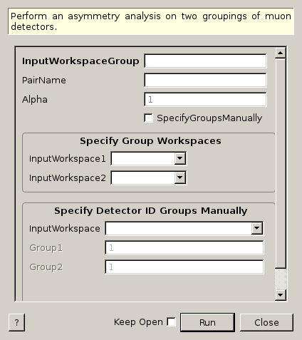 The algorithm is essentially a wrapper around the MuonProcess v1 algorithm, performing an asymmetry calculation on a pair of groups of detectors. These groups may be specified manually, allowing various processing options such as rebinning and dead time correction, or alternatively the algorithm accepts two workspaces which are assumed to contain the processed groups as a single spectra.