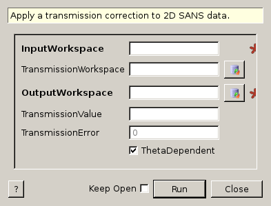 | TransmissionValue | Input | number | Optional | Transmission value to apply to all wavelengths. If specified, TransmissionWorkspace will not be used. |