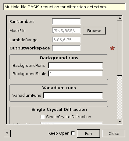 | MaskFile | Input | string | /SNS/BSS/shared/autoreduce/new_masks_08_12_2015/BASIS_Mask_default_diff.xml | See documentation for latest mask files. Allowed extensions: [‘.xml’] |