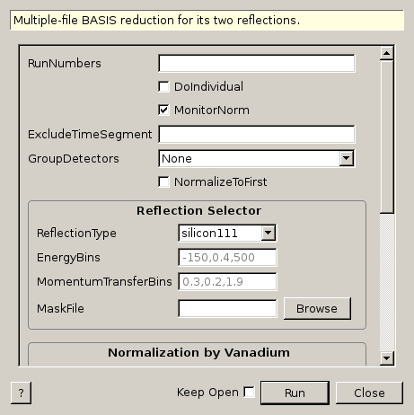 | NormalizationType | Input | string | by Q slice | Select a Vanadium normalization. Allowed values: [‘by Q slice’, ‘by detector ID’] |