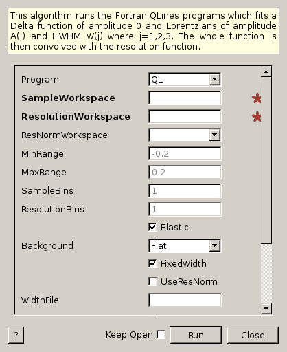 | ResolutionWorkspace | Input | MatrixWorkspace | Mandatory | Name of the resolution input Workspace |