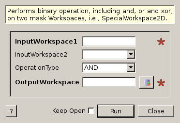 Performs binary operation, including and, or and xor, on two mask Workspaces, i.e., SpecialWorkspace2D.