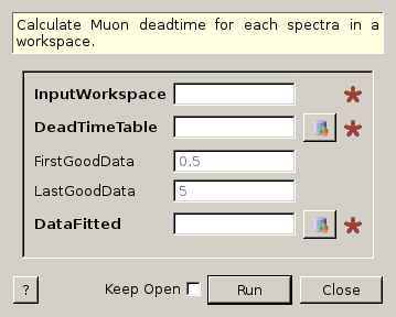 | DeadTimeTable | Output | TableWorkspace | Mandatory | The name of the TableWorkspace in which to store the list of deadtimes for each spectrum |