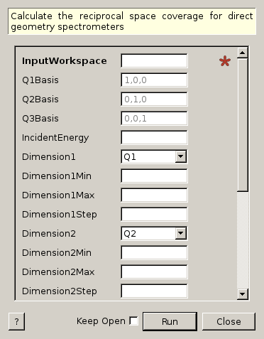 DimensionI, where I is from 1 to 4, allows one to select in which order Q1, Q2, Q3, DeltaE are stored in the output workspace. The algorithm will complain if you select the same dimension twice. For each dimension one can define minimum, maximum, and step size. If no minimum/maximum are set for DeltaE, these are chosen to be +/-Ei. If not specified, minimum/maximum for the Q dimensions are calculated based on the instrument geometry, incident energy, minimum/maximum for DeltaE, and lattice parameters.