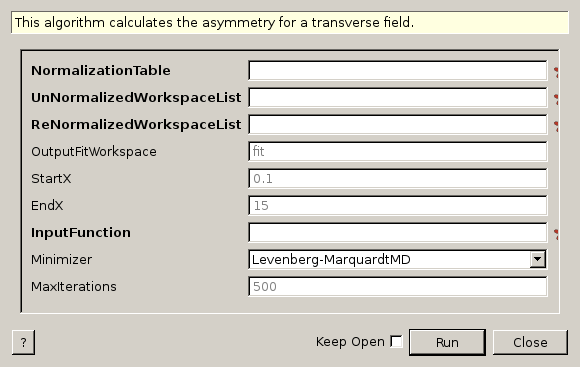 | NormalizationTable | Input | TableWorkspace | Mandatory | Name of the table containing the normalizations for the asymmetries. |