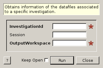 This algorithm retrieves the information of the datafiles associated to an investigation, and saves the results to a workspace.