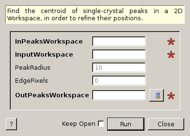 | InPeaksWorkspace | Input | PeaksWorkspace | Mandatory | A PeaksWorkspace containing the peaks to centroid. |