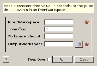 | TimeOffset | Input | number | 0 | Number of seconds (a float) to add to each event’s pulse time. Required. |