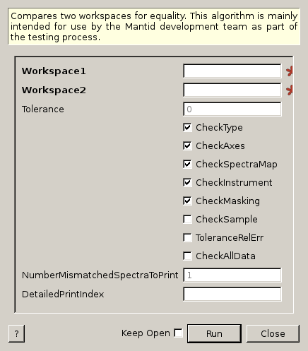 Compares two workspaces for equality. This algorithm is mainly intended for use by the Mantid development team as part of the testing process.