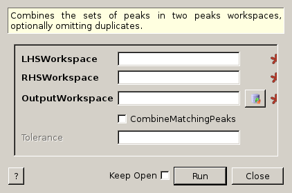 | CombineMatchingPeaks | Input | boolean | False | Whether to combine peaks that are identical across the two workspaces |