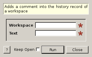This simple algorithm just adds a comment record to the history of a workspace and is a simple way of annotating your workflow.