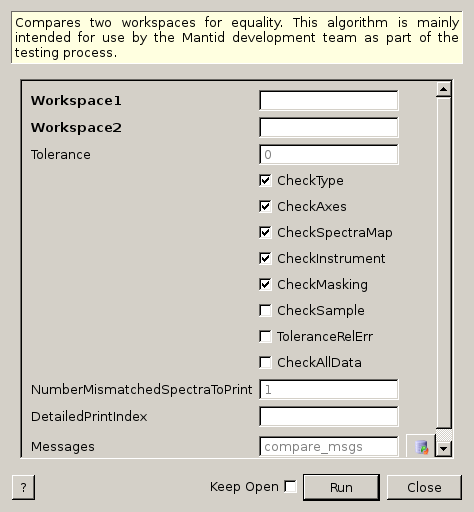 Compares two workspaces for equality. This algorithm is mainly intended for use by the Mantid development team as part of the testing process.
