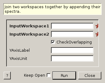 ConjoinWorkspaces(InputWorkspace1=ws1, InputWorkspace2=ws2, CheckOverlapping=False, YAxisUnit="New unit", YAxisLabel="New label")