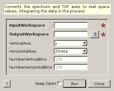 This converts the workspace into a 2D view of real space detector positions based on the detector positions. This is intended for rapid visualization and has been optimized for speed for use in Live data streams. If the data provided has data binned in Time of flight or any other unit this will be integrated into a single value per detector, before converting to the selected detector and rebinning to the new grid. The output grid is based in the maximum and minimum values of the detectors for axes selected, and the number of bins selected. The rebinning is simply based on centre point rebinning, and as such can be prone to moire based artefacts, however it is fast.
