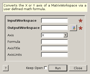 This algorithm allows users to adjust the axes of a workspace by a user defined math formula. It will adjust the data values (other than in one case the X values) of a workspace, although it will reverse the spectra if needed to keep the X values increasing across the workspace. This only works for MatrixWorkspaces, so will not work on Multi Dimensional Workspaces or Table Workspaces. If you specify one of the known Units from the Unit Factory then that will be the resulting unit, otherwise like the ConvertSpectrumAxis v2 algorithm the result of this algorithm will have custom units defined for the axis you have altered, and as such may not work in all other algorithms.