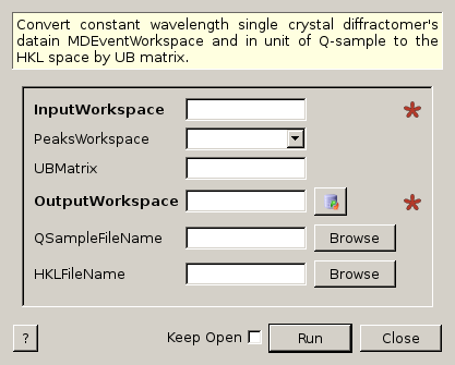 | OutputWorkspace | Output | MDEventWorkspace | Mandatory | Name of the output MDEventWorkspace in HKL-space. |