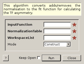 | Mode | Input | string | Construct | Mode to run in. Construct will convert theinput function into one suitable for calculating the TF Asymmetry. Extract will find the original user function from a function that is suitable for TF Asymmetry calculations. Allowed values: [‘Extract’, ‘Construct’] |