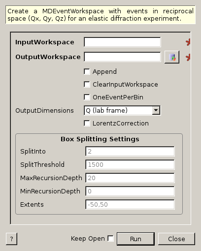 | OutputWorkspace | Output | MDEventWorkspace | Mandatory | Name of the output MDEventWorkspace. If the workspace already exists, then the events will be added to it. |
