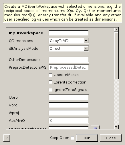 | OutputWorkspace | Output | MDEventWorkspace | Mandatory | Name of the output MDEventWorkspace. |