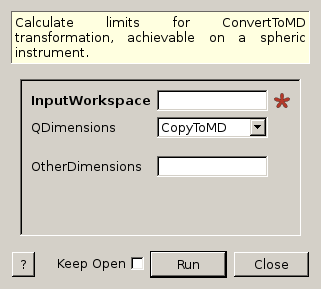 | QDimensions | InOut | string | CopyToMD | String, describing MD-analysis modes, this algorithm can process. There are 3 modes currently available and described in details on*MD Transformation factory* page. The modes names are CopyToMD, |Q| and Q3D. Allowed values: [‘CopyToMD’, ‘Q3D’, ‘|Q|’] |