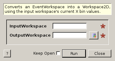 | InputWorkspace | Input | MatrixWorkspace | Mandatory | An input EventWorkspace. |