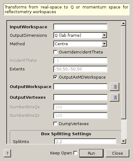 | NumberBinsQz | Input | number | 100 | The number of bins along the qx axis. Optional and only applies to 2D workspaces. Defaults to 100. |