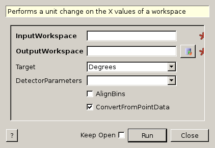| Target | Input | string | Mandatory | The name of the units to convert to (must be one of those registered in the Unit Factory). Allowed values: [‘Degrees’, ‘DeltaE’, ‘DeltaE_inFrequency’, ‘DeltaE_inWavenumber’, ‘dSpacing’, ‘dSpacingPerpendicular’, ‘Empty’, ‘Energy’, ‘Energy_inWavenumber’, ‘Label’, ‘Momentum’, ‘MomentumTransfer’, ‘QSquared’, ‘SpinEchoLength’, ‘SpinEchoTime’, ‘Time’, ‘TOF’, ‘Wavelength’] |
