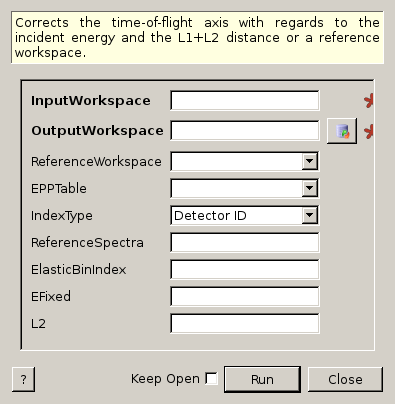 Corrects the time-of-flight axis with regards to the incident energy and the L1+L2 distance or a reference workspace.