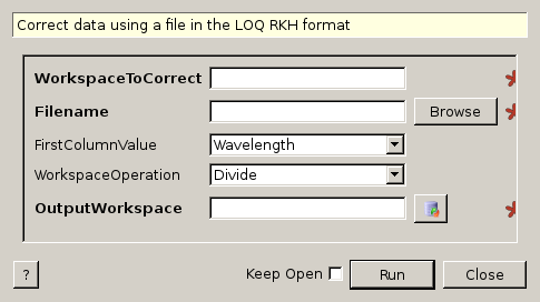 | FirstColumnValue | Input | string | Wavelength | The units of the first column of the correction file (default wavelength). Allowed values: [‘Degrees’, ‘DeltaE’, ‘DeltaE_inFrequency’, ‘DeltaE_inWavenumber’, ‘dSpacing’, ‘dSpacingPerpendicular’, ‘Empty’, ‘Energy’, ‘Energy_inWavenumber’, ‘Label’, ‘Momentum’, ‘MomentumTransfer’, ‘QSquared’, ‘SpinEchoLength’, ‘SpinEchoTime’, ‘Time’, ‘TOF’, ‘Wavelength’, ‘SpectrumNumber’] |