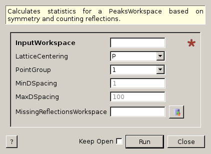 | InputWorkspace | Input | PeaksWorkspace | Mandatory | A workspace with peaks to calculate statistics for. Sample with valid UB-matrix is required. |