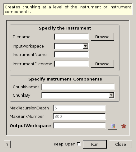 | InstrumentFilename | Input | string | Optional: Path to the instrument definition file on which to base the ChunkingWorkpace. Allowed extensions: [‘.xml’] | |