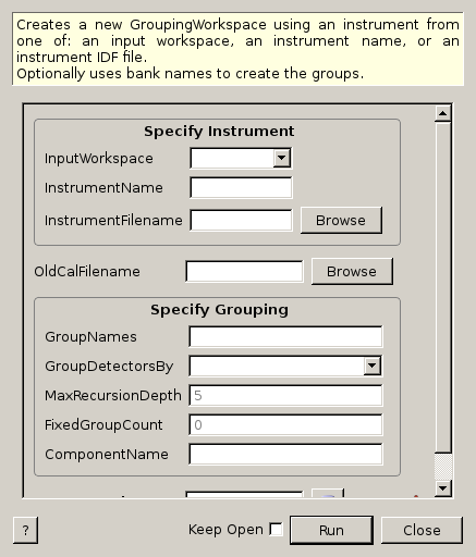 | InstrumentName | Input | string | Optional: Name of the instrument to base the GroupingWorkspace on which to base the GroupingWorkspace. | |