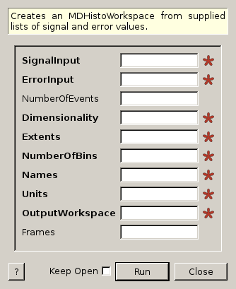 Takes two arrays of signal and error values, as well as information describing the dimensionality and extents, and creates a MDHistoWorkspace (histogrammed multi-dimensional workspace). The SignalInput and ErrorInput arrays must be of equal length and have a length that is equal to the product of all the comma separated arguments provided to NumberOfBins. The order in which the arguments are specified to each of the properties (for those taking multiple arguments) is important, as they are assumed to match by the order they are declared. For example, specifying Names = A,B and Units = U1,U2 will generate two dimensions, the first with a name of A and units of U1 and the second with a name of B and units of U2. The same logic applies to the Extents inputs. Signal and Error inputs are read in such that, the first entries in the file will be entered across the first dimension specified, and the zeroth index in the other dimensions. The second set of entries will be entered across the first dimension and the 1st index in the second dimension, and the zeroth index in the others.