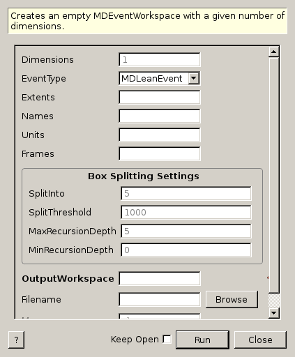 | OutputWorkspace | Output | Workspace | Mandatory | Name of the output MDEventWorkspace. |